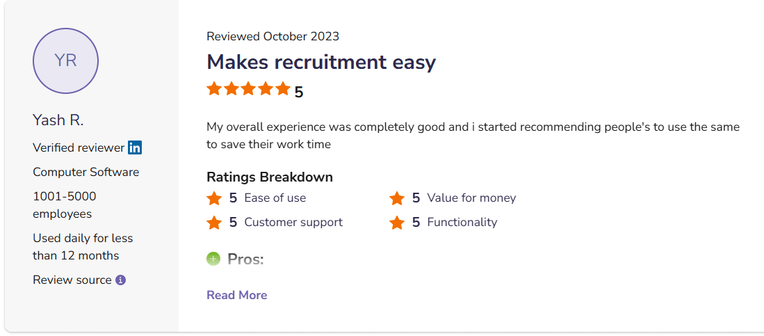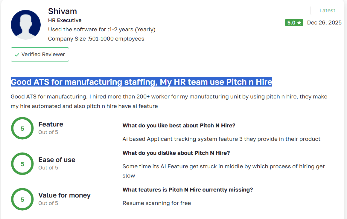 “Good ATS for manufacturing staffing, My HR team use” —Shivam. SoftwareSuggest