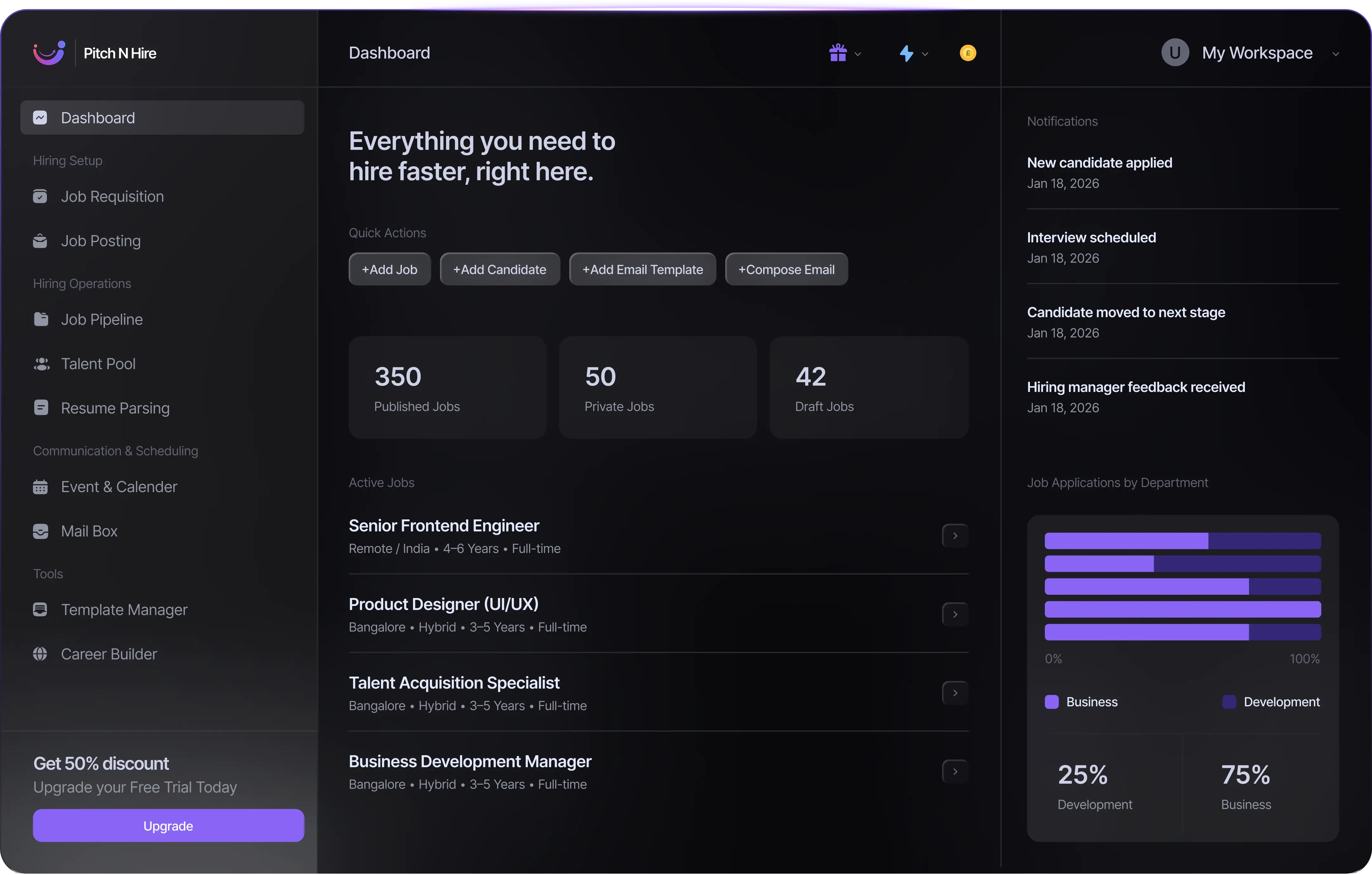 Create, track, and control every open role from one structured hiring pipeline.